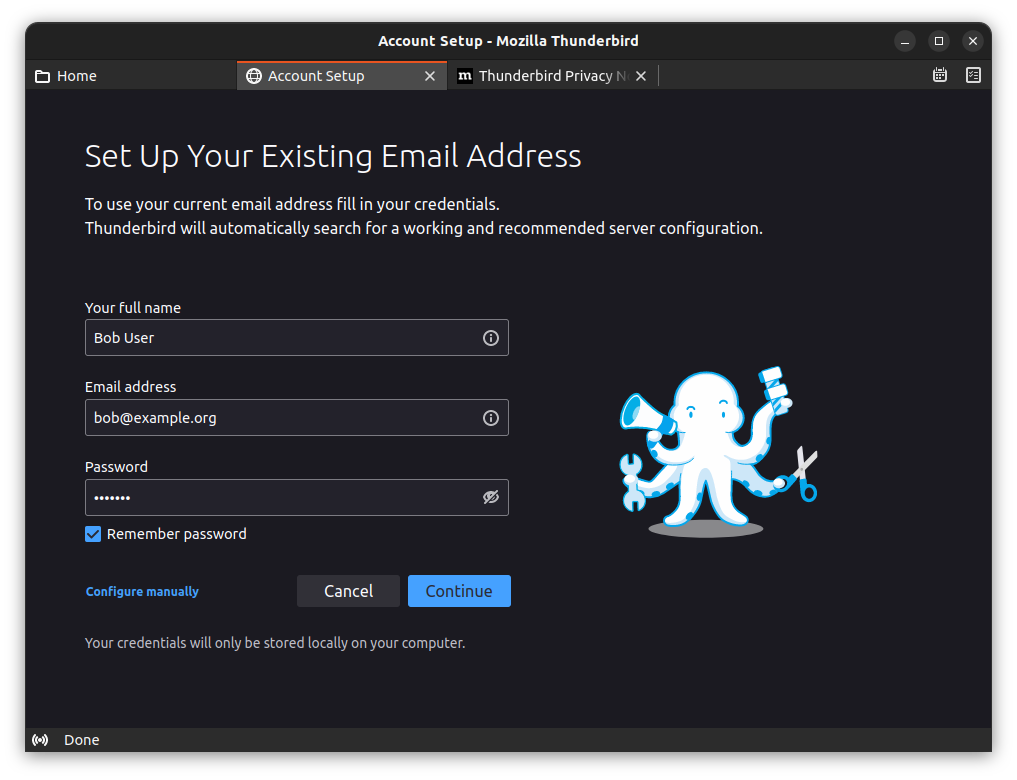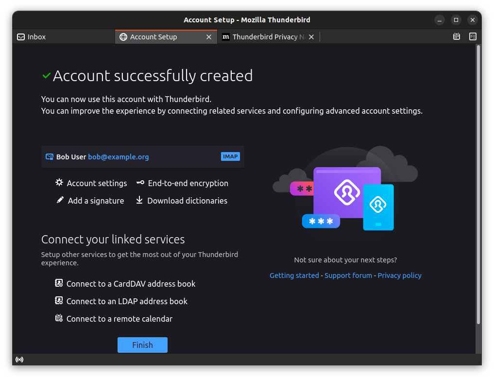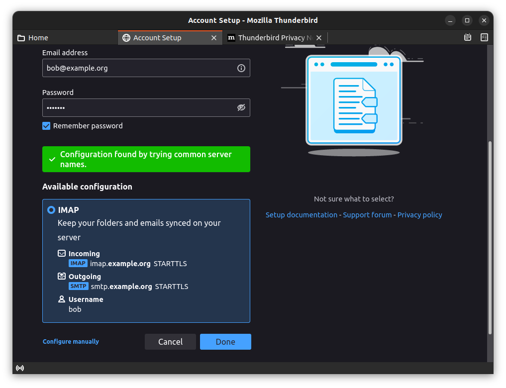 Behind the scenes, Thunderbird did a whole bunch of DNS queries. Since we setup the SRV and CNAME records it was able to guess the correct IMAP and SMTP servers. Also note, that both connection will be encrypted with STARTTLS.