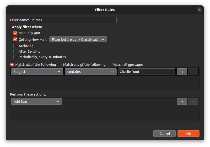 Here we give the filter a name 'filter1' and match on any subject that contains 'Charlie Root'. When it matches we star the mail so it pops out in our Inbox.