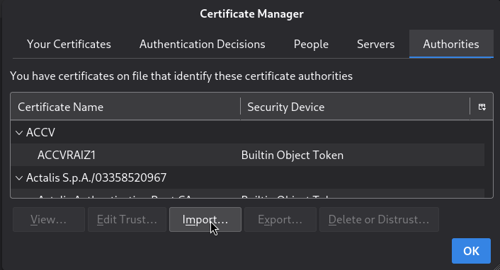 In the Certificate Manager dialog select the Authorities tab then Import button.