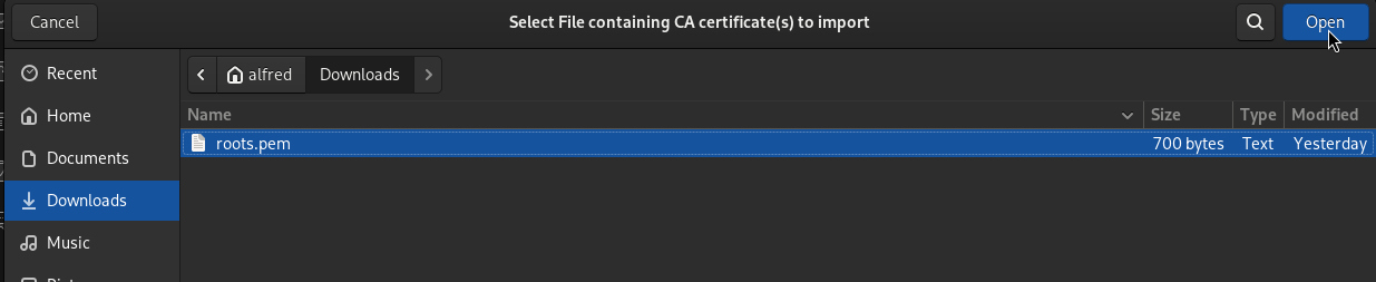 Select the certificate PEM file that contains the our CA certificate. Then click Open.