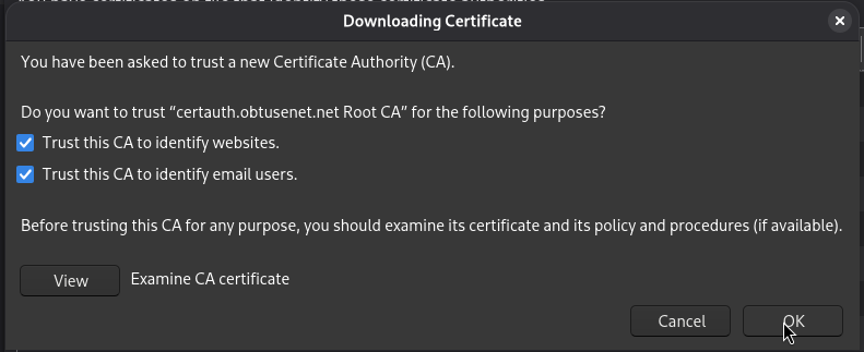 Recall we are using our own certificate authority to secure our servers. We will need to load the CA certificate into the clients / systems so that our certificate authority is trusted. The trusted certificate can be download from https://certauth.example.org/roots.pem. Once downloaded, follow instructions of the device / client to trust the certificate.