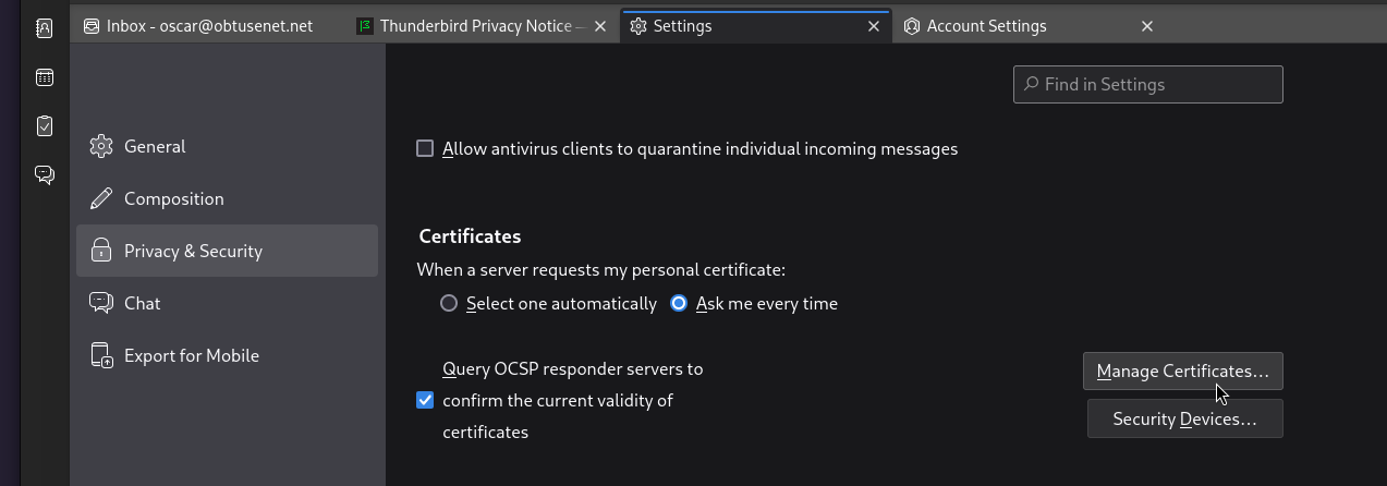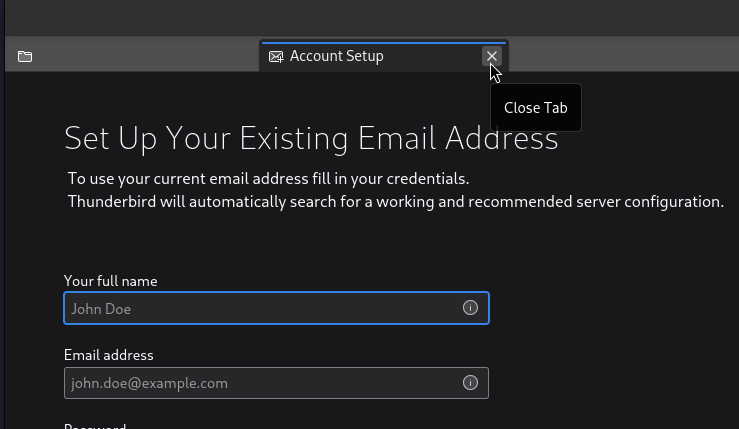 When the Thunderbird client first starts it will ask to create an account. Normally this is exactly what we want to happen. However, since Thunderbird does not use the system certificate store, we need to add our CA certificate to the trusted store on Thunderbird.