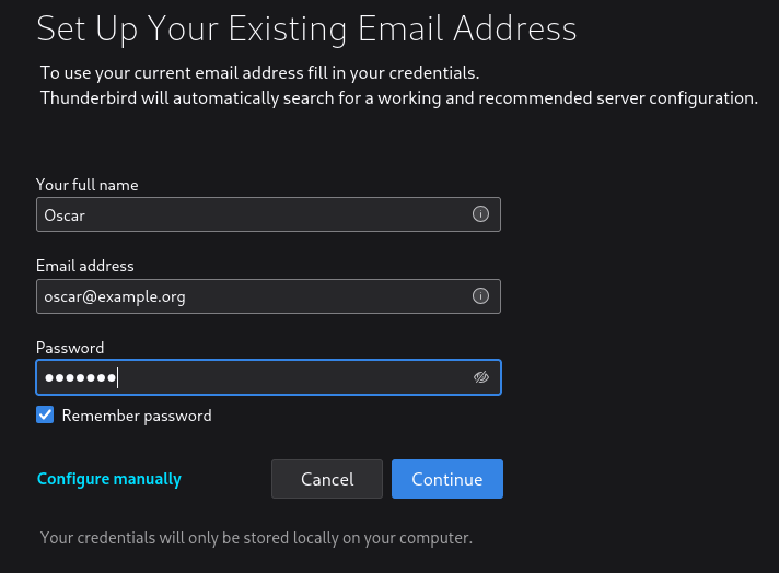 Enter your username email address and password into the boxes and click Continue. Thunderbird will try to guess your sites settings.