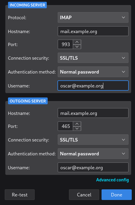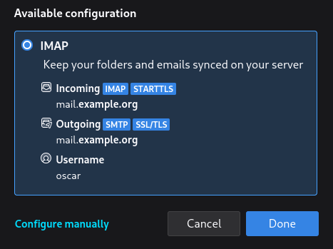 <?xml version="1.0" encoding="UTF-8"?> <clientConfig version="1.1"> <emailProvider id="example.org"> <domain>example.org</domain> <incomingServer type="imap"> <hostname>mail.example.org</hostname> <port>993</port> <socketType>SSL</socketType> <username>%EMAILADDRESS%</username> <authentication>password-cleartext</authentication> </incomingServer> <outgoingServer type="smtp"> <hostname>mail.example.org</hostname> <port>465</port> <socketType>SSL</socketType> <username>%EMAILADDRESS%</username> <authentication>password-cleartext</authentication> </outgoingServer> </emailProvider> </clientConfig>